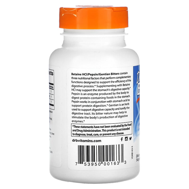 Betaine HCl/Pepsin/Gentian Bitters contains three nutritional factors that perform complementary functions designed to support the efficiency of the digestive process. Supplementing with Betaine HCl may support the stomach's digestive capacity. Pepsin is an enzyme produced by the body to digest protein-containing foods in the stomach. Pepsin works in conjunction with stomach acid to support protein digestion. Gentian is an herb used to support digestive capacity and tonify the digestive tract. Its bitter nature may help to stimulate the body's production of digestive enzymes.